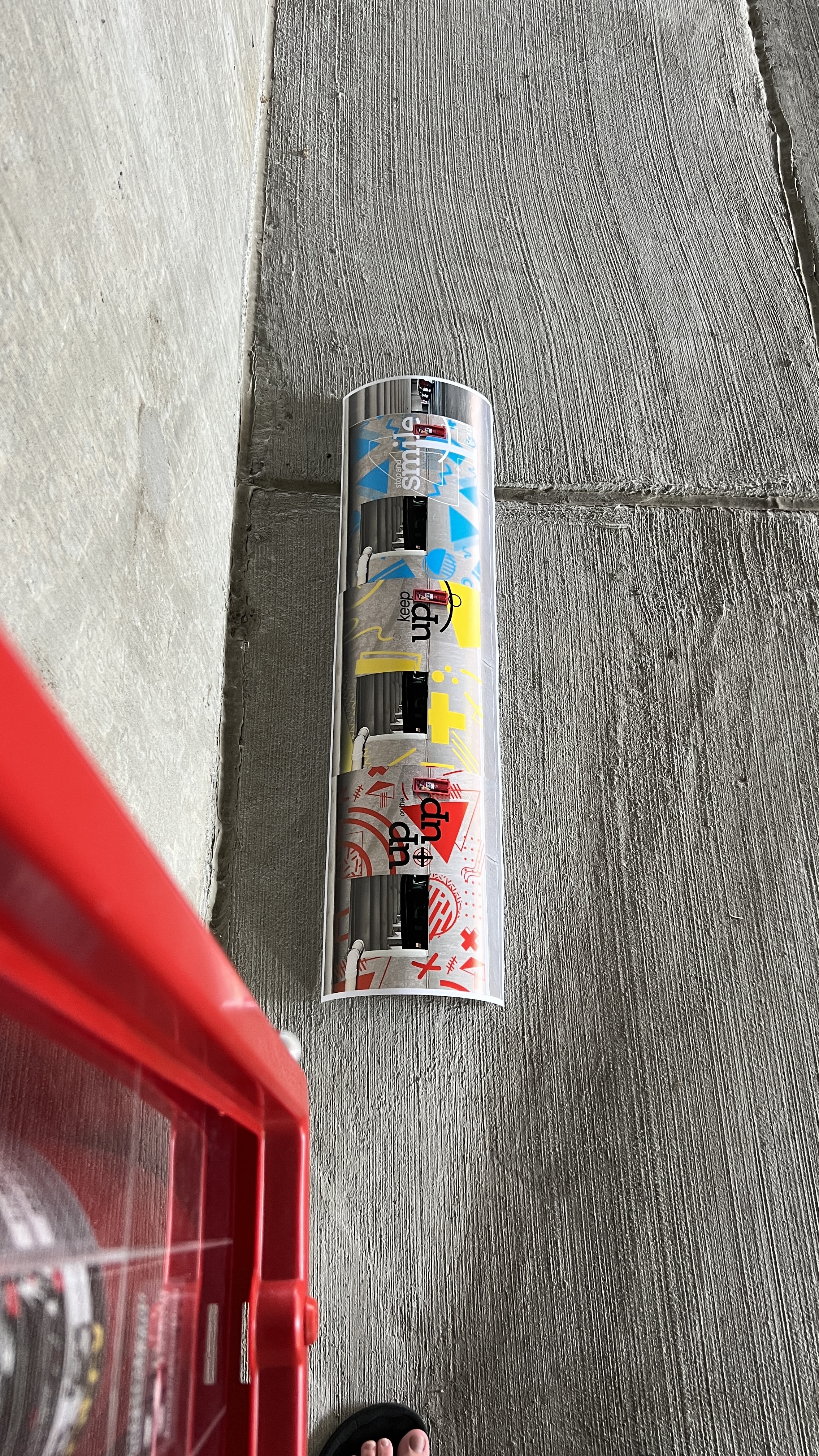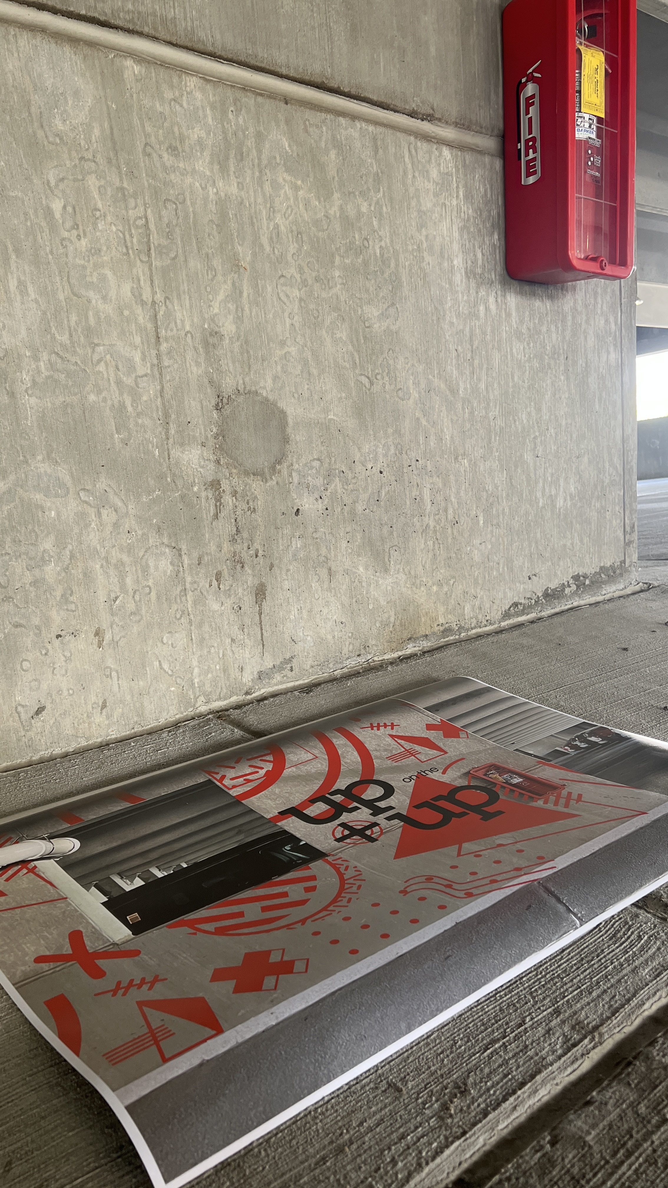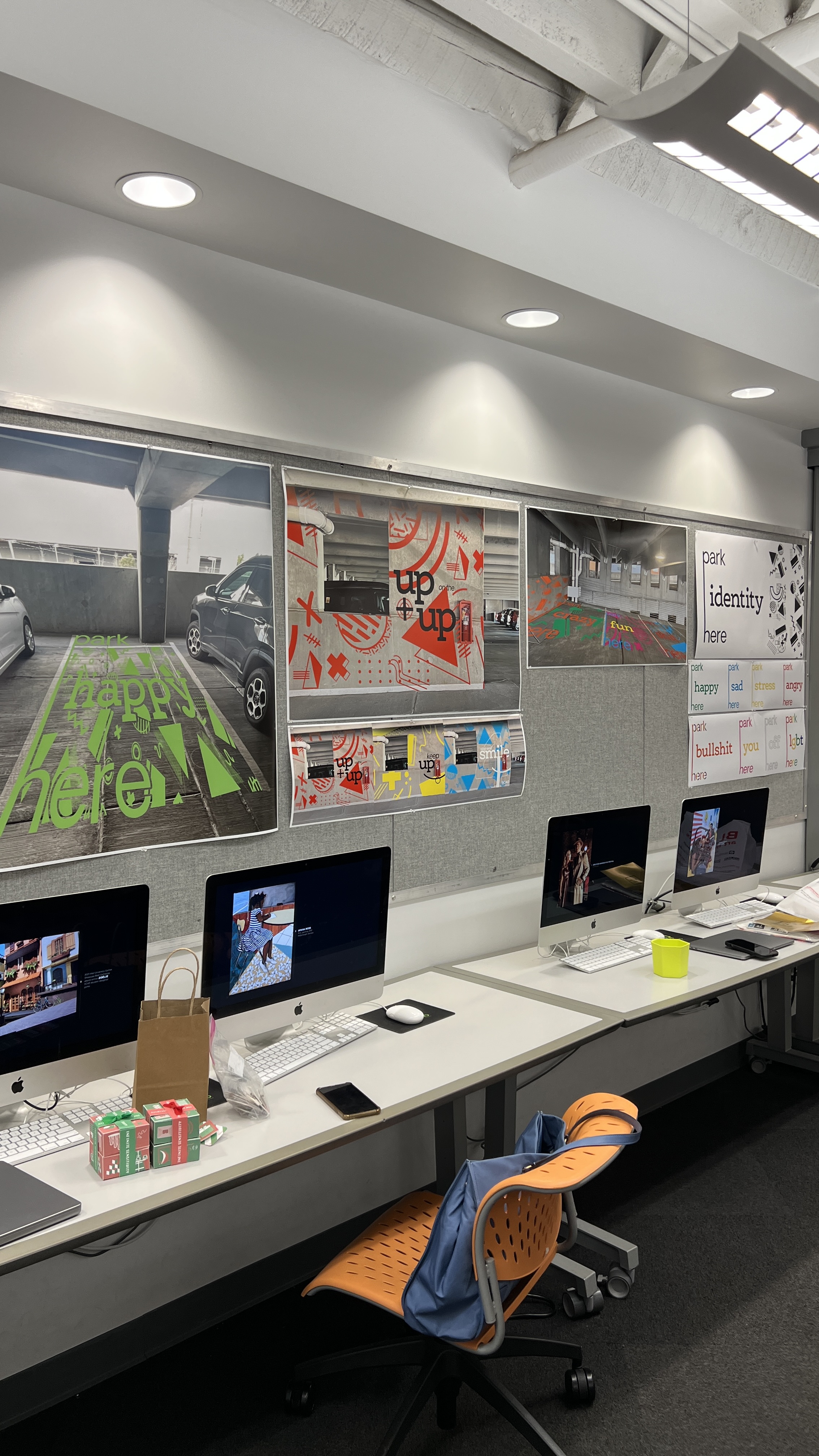This was the "eureka" moment wherein the identity formed. It resulted from a mental breakdown, as most creative processes involve. The final identity pairs a combination of sans serif and serif type with Memphis-style backgrounds: the latter provides fun flavor. The resulting identity forms a parking space wherein the emotion/identity centrally parks itself. However, it can also form the bumper of a vehicle. Overall, the identity proves highly versatile and adaptable.